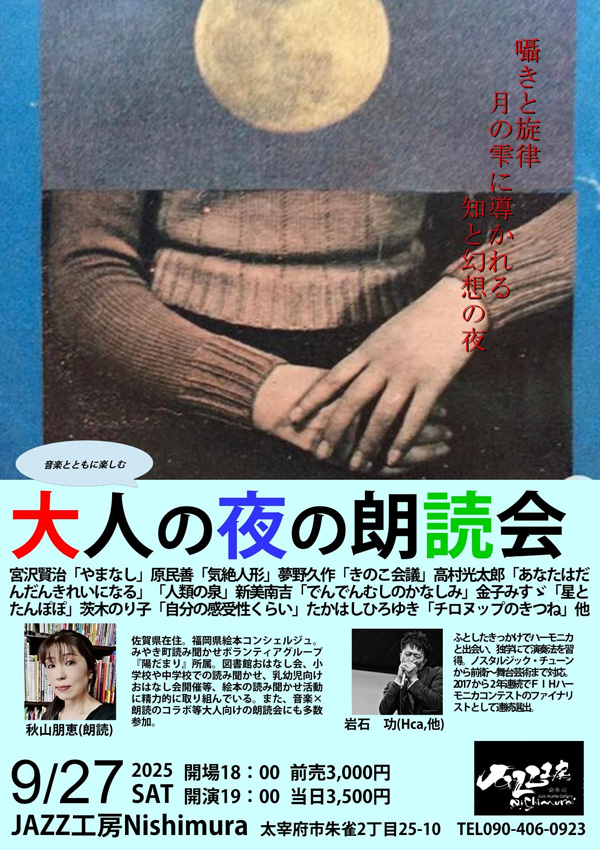 2025/9/27(土) 大人の夜の朗読会 / 秋山朋恵(朗読)・岩石功(ハーモニカ)