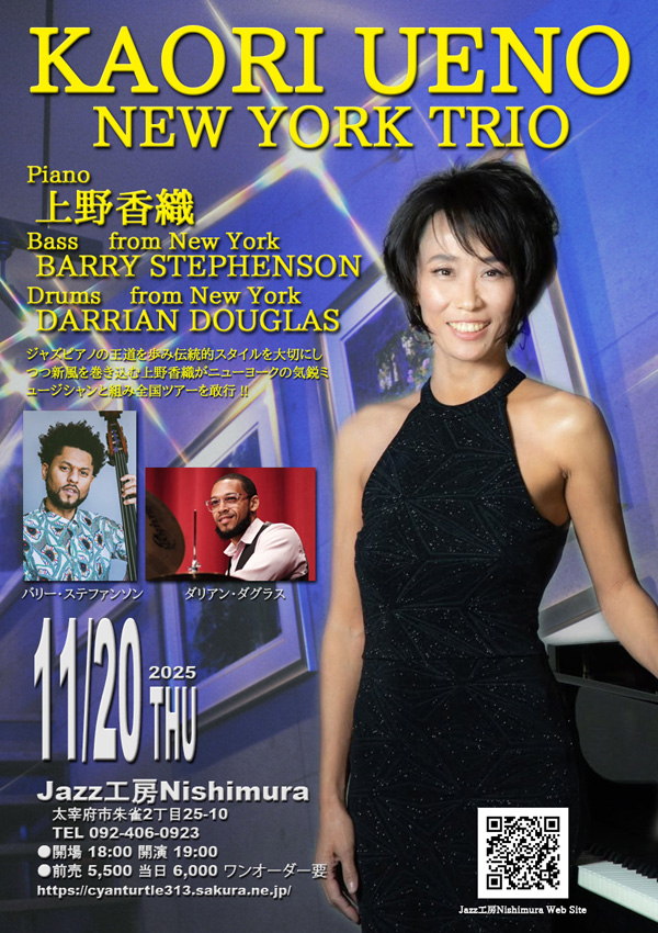 上野香織がニューヨークの俊英、Barry Stephenson(b)、Darrian Douglas(d)を呼応してお贈りするニューヨークの香り満載のピアノトリオの真髄、これを聴かずしてジャズは語れない........