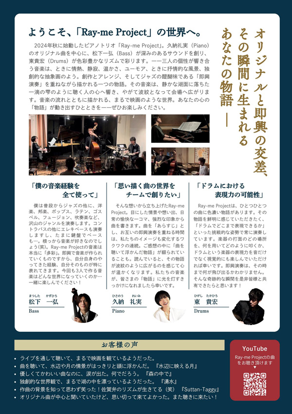 2024年に始動したピアノトリオ「Ray-mi Project」。久納礼実(Piano)のオリジナル曲を中心に松下一弘(Bass)が深みのあるサウンドを創り、東貴宏(Drums)が色彩豊かなリズムで彩ります。三人の個性が響きあう音楽は時に情熱、静寂、暖かさ、ユーモア、時に抒情的な風景、独奏多岐な抽象画を描きます。是非、物語をお楽しみ下さい。
