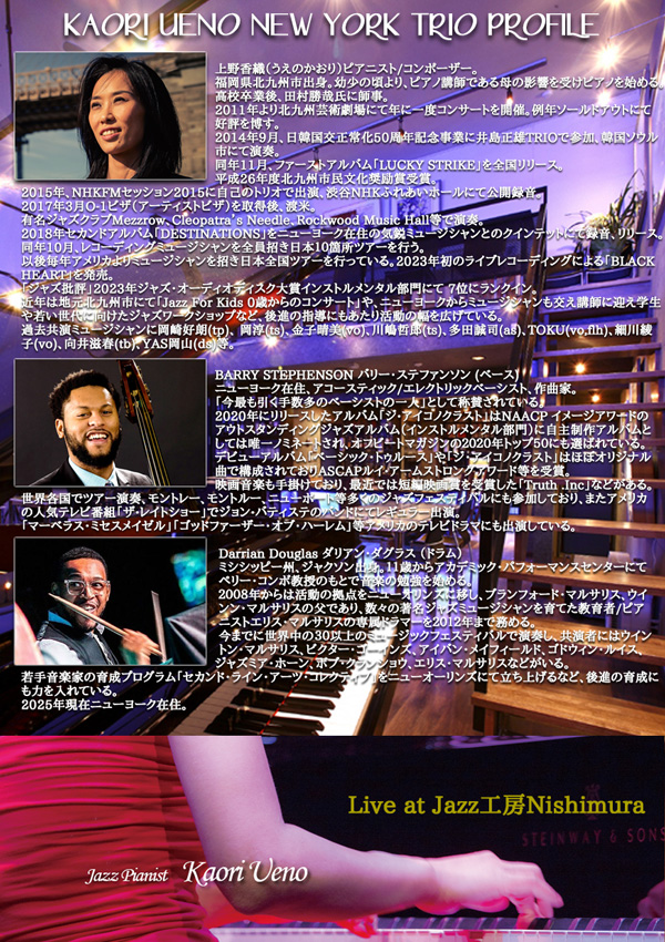 上野香織がニューヨークの俊英、Barry Stephenson(b)、Darrian Douglas(d)を呼応してお贈りするニューヨークの香り満載のピアノトリオの真髄、これを聴かずしてジャズは語れない........